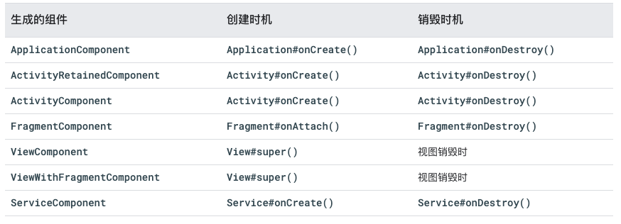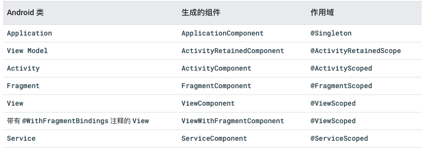 对于之前提到的@InstallIn会关联不同的Android类,除了@ActivityComponent还有以下几种